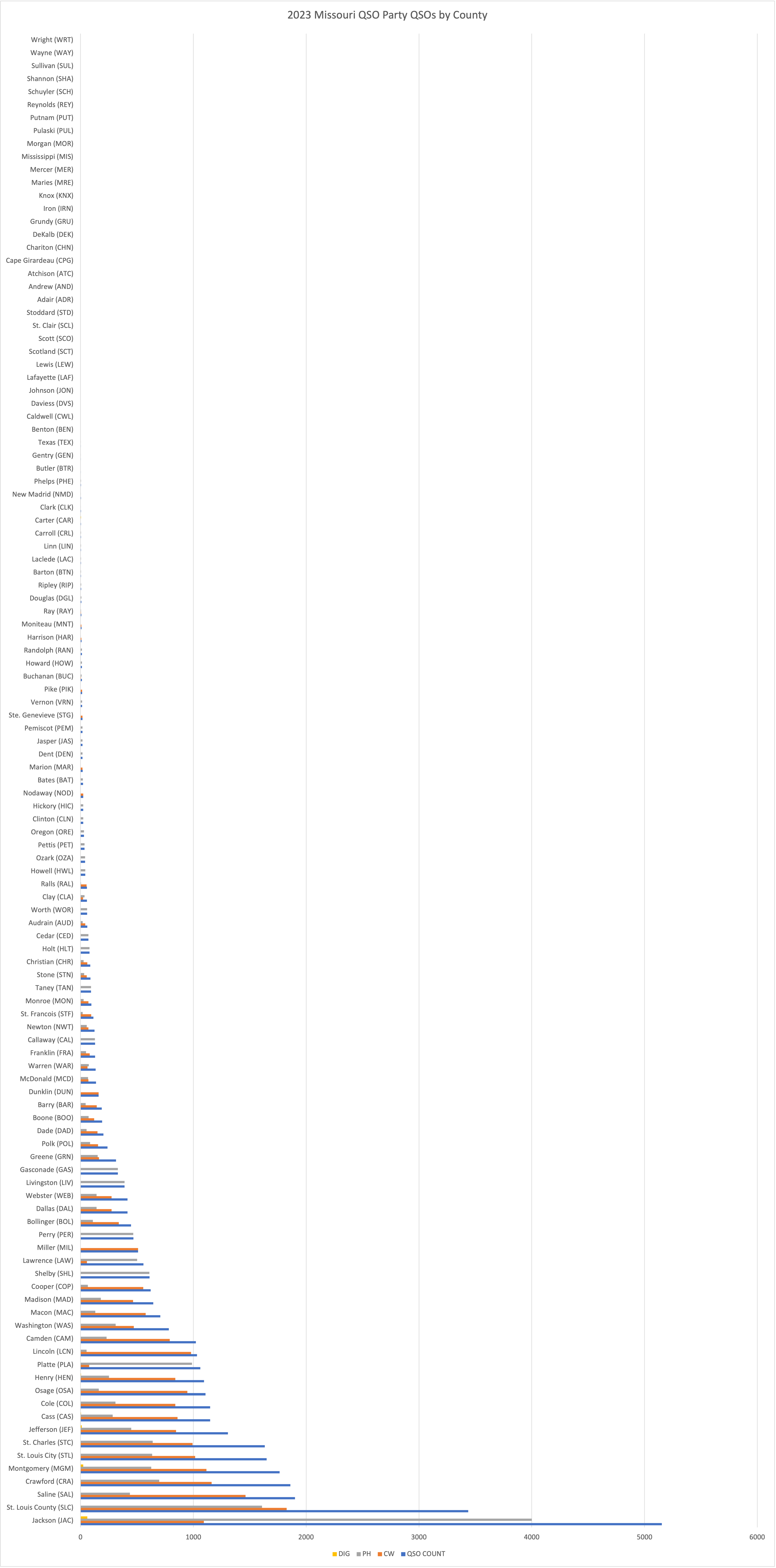 | COUNTY (ABREV) | QSO COUNT | CW | PH | DIG |